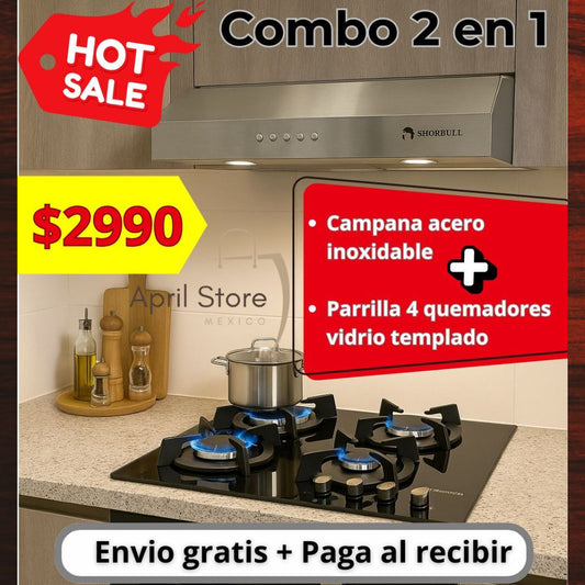 Parrilla 4 quemadores vidrio templado + Campana acero inoxidable