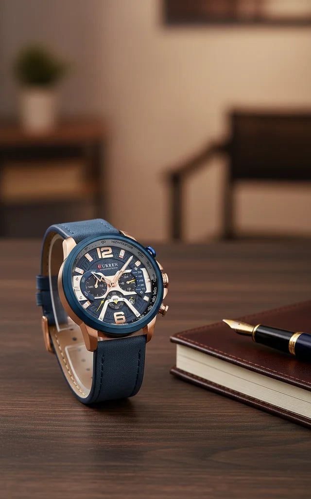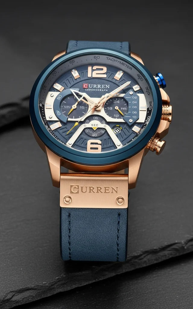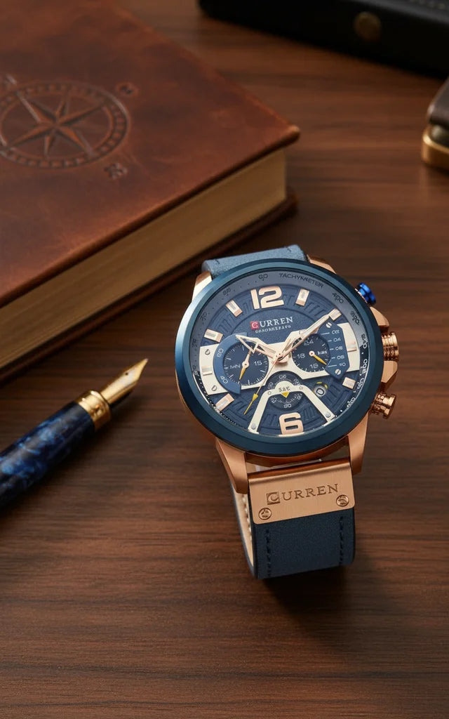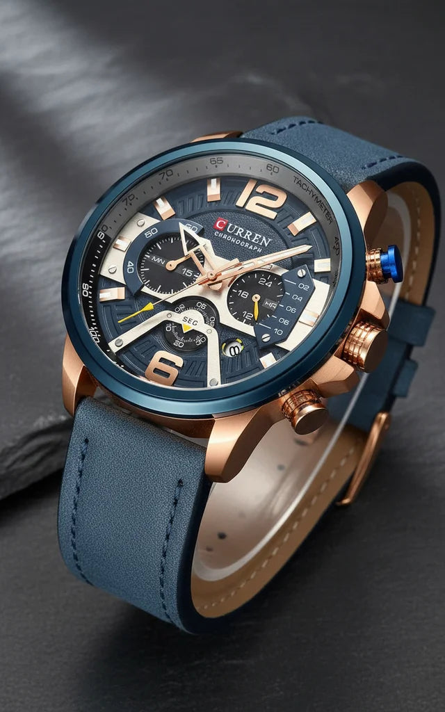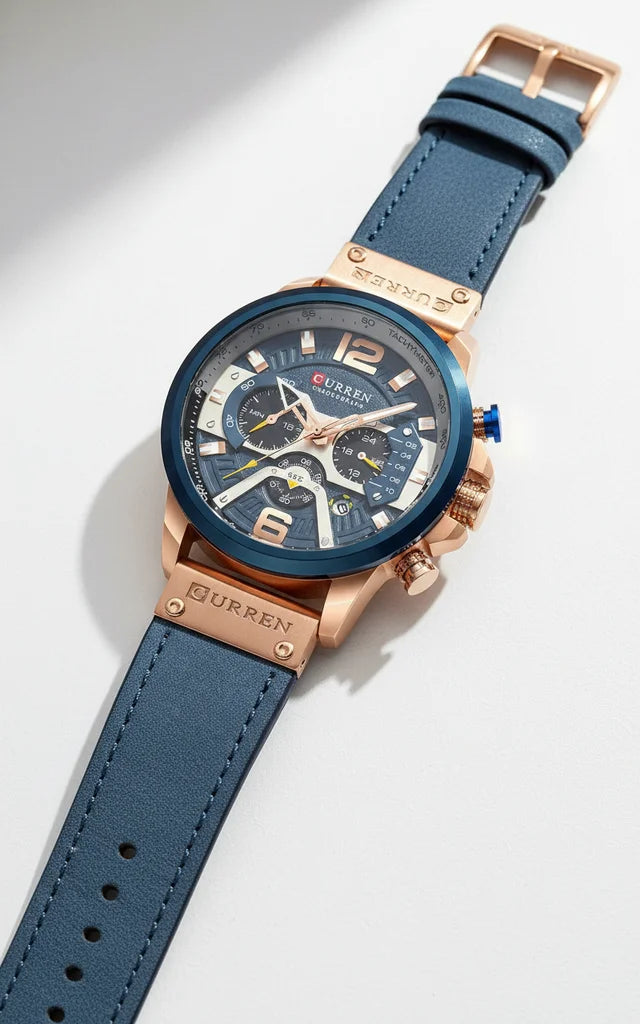 Su correa de cuero azul y detalles dorados le dan un toque sofisticado, mientras que los sub-diales del cronógrafo le aportan esa funcionalidad deportiva. Es el equilibrio perfecto.