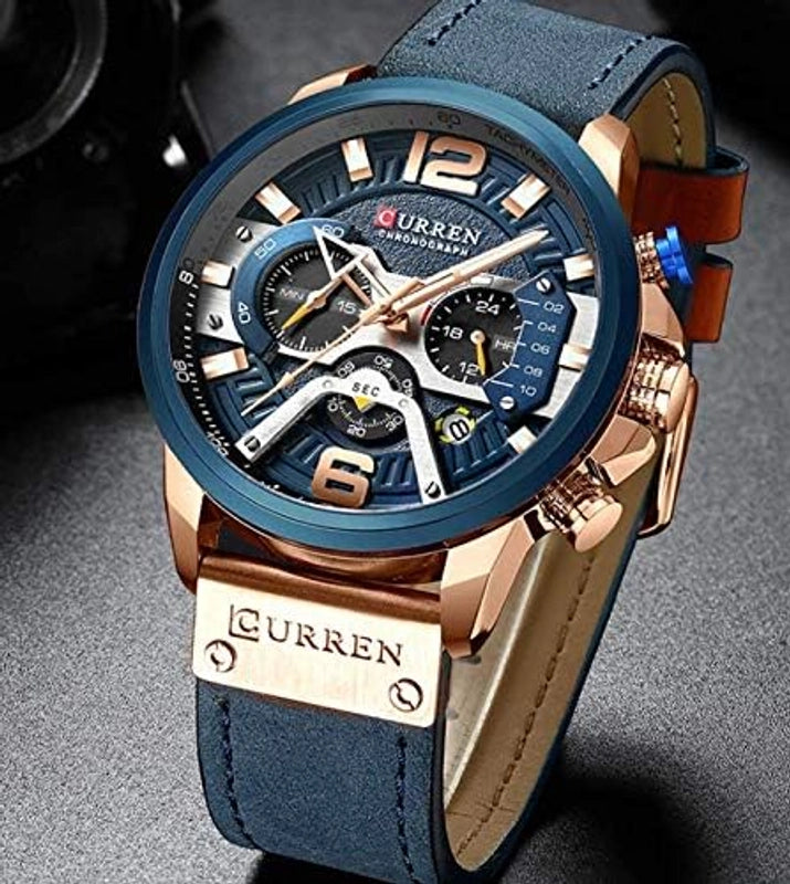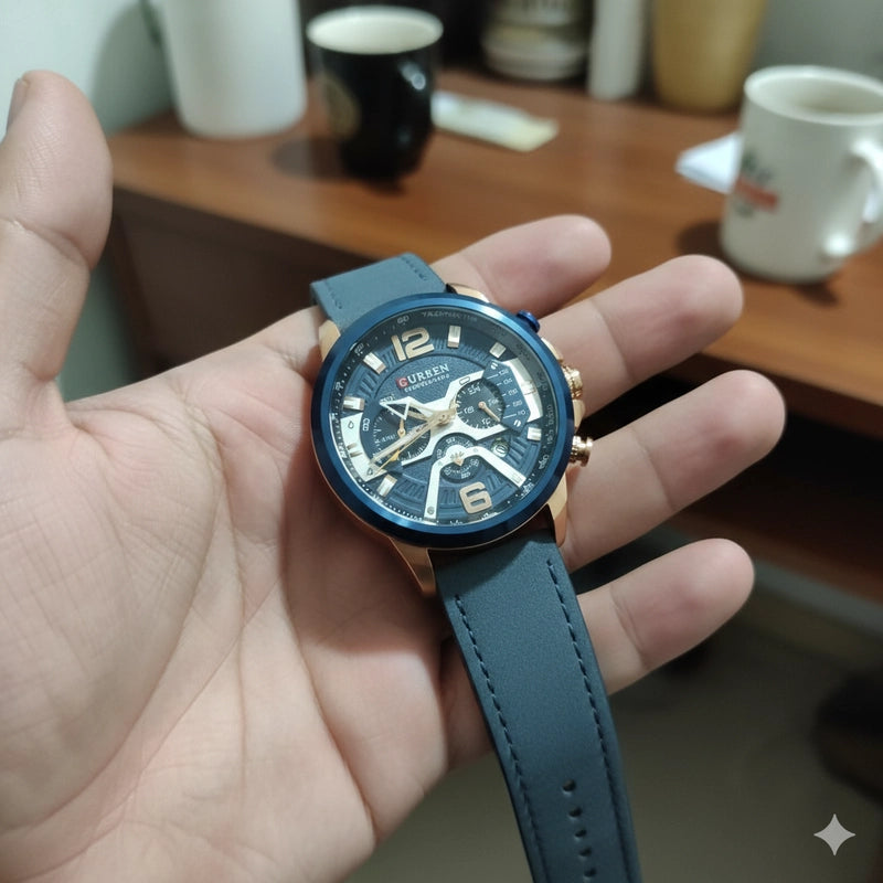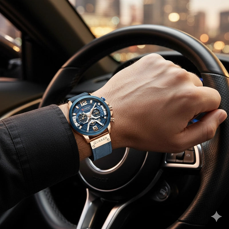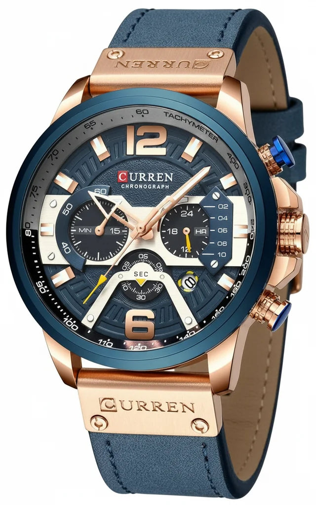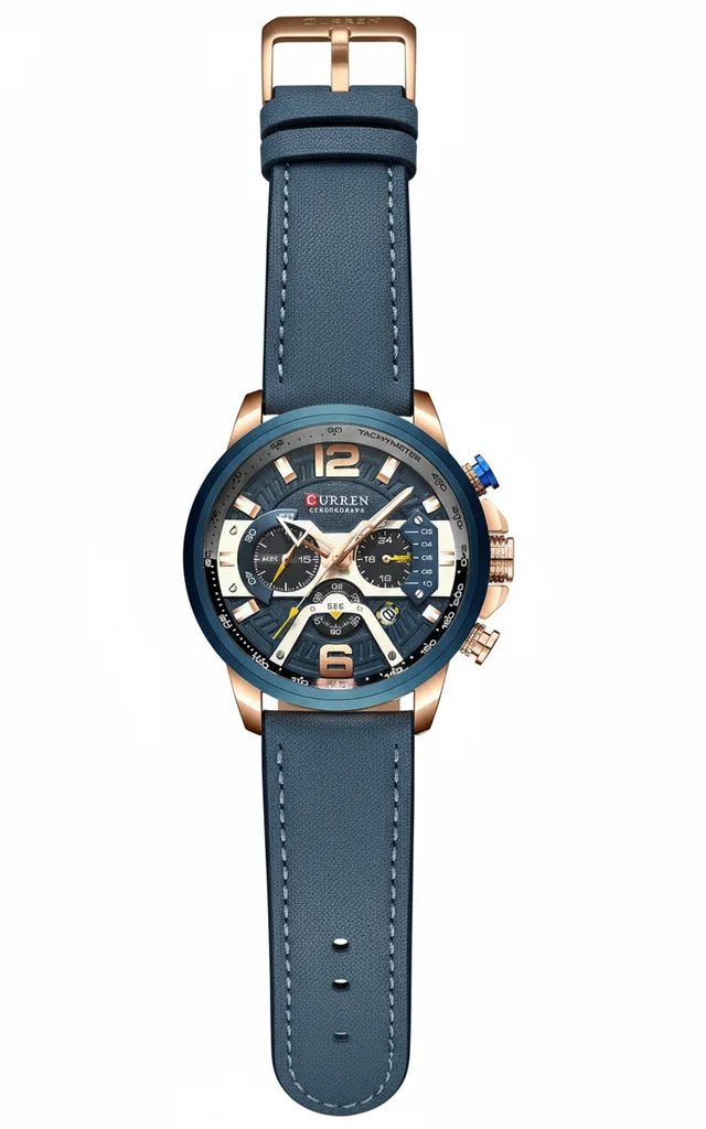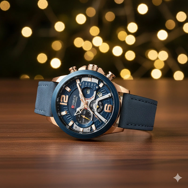 Su correa de cuero azul y detalles dorados le dan un toque sofisticado, mientras que los sub-diales del cronógrafo le aportan esa funcionalidad deportiva. Es el equilibrio perfecto.