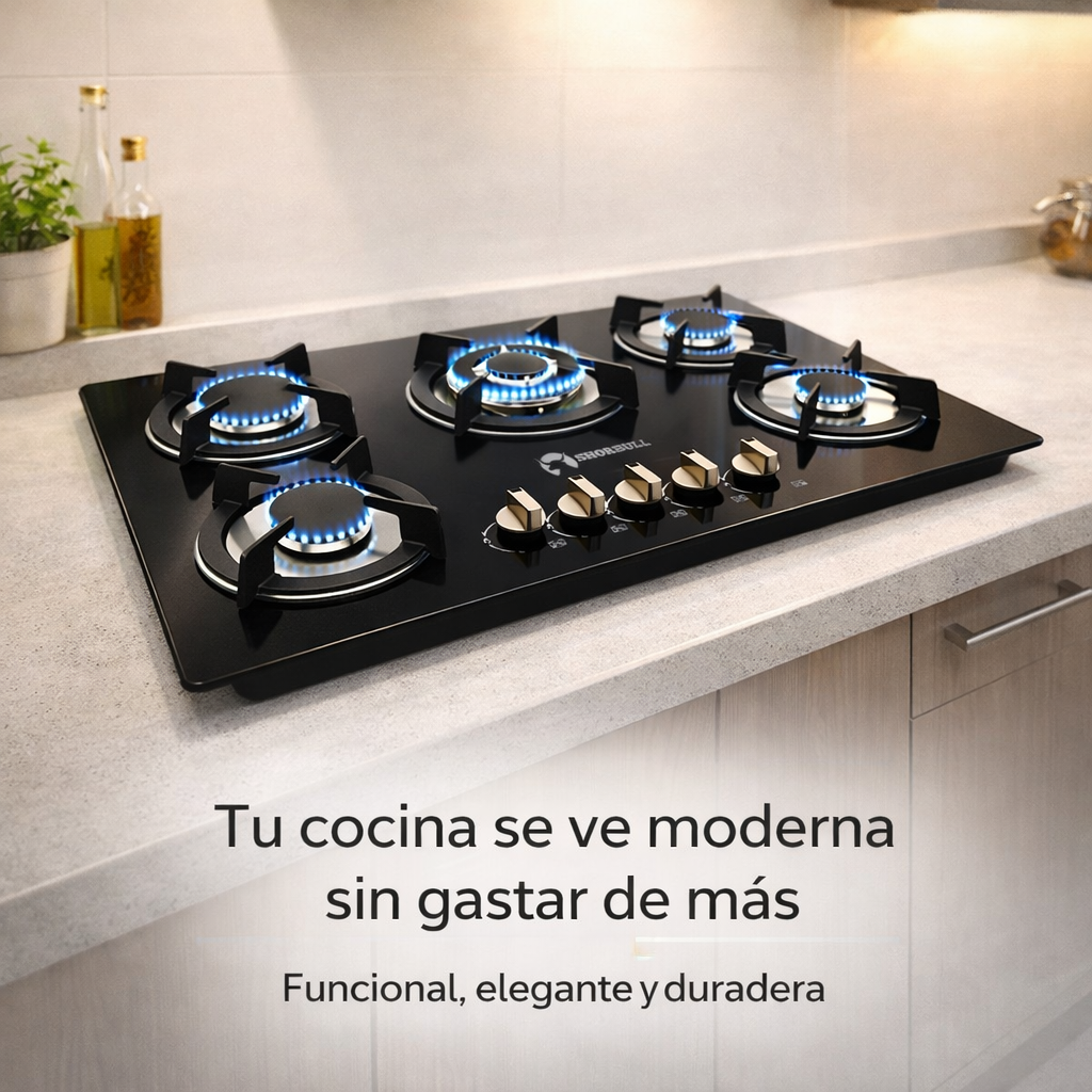 La Parrilla Estufa de 5 Quemadores con Cubierta de Vidrio Templado está diseñada justo para eso: cocinar sin cochambre acumulado, limpiar en segundos y darle un look moderno a tu cocina.